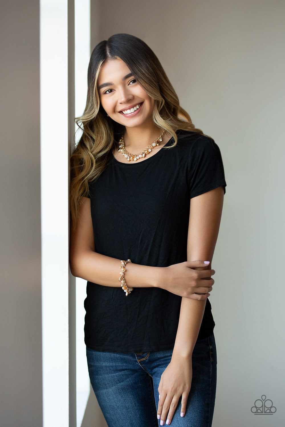 A glittery collection of sparking white rhinestones, faceted gold beads, and golden crystal-like beads dangle from a shimmery gold chain, creating a refined fringe below the collar. Features an adjustable clasp closure. Paparazzi Accessories. Jewelry are always lead and nickel free. #P2RE-GDXX-292PH