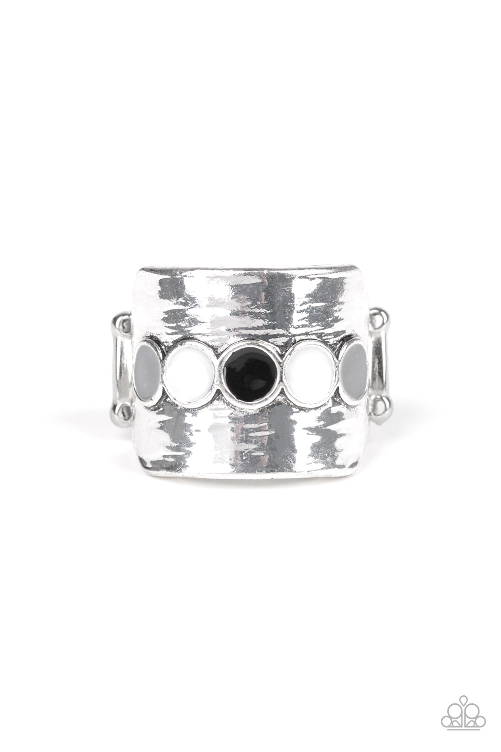 Painted in black, gray, and shiny white finishes, round frames dot the center of a thick silver band for a colorful tribal look. Features a stretchy band for a flexible fit. #P4TR-WTXX-040XX
