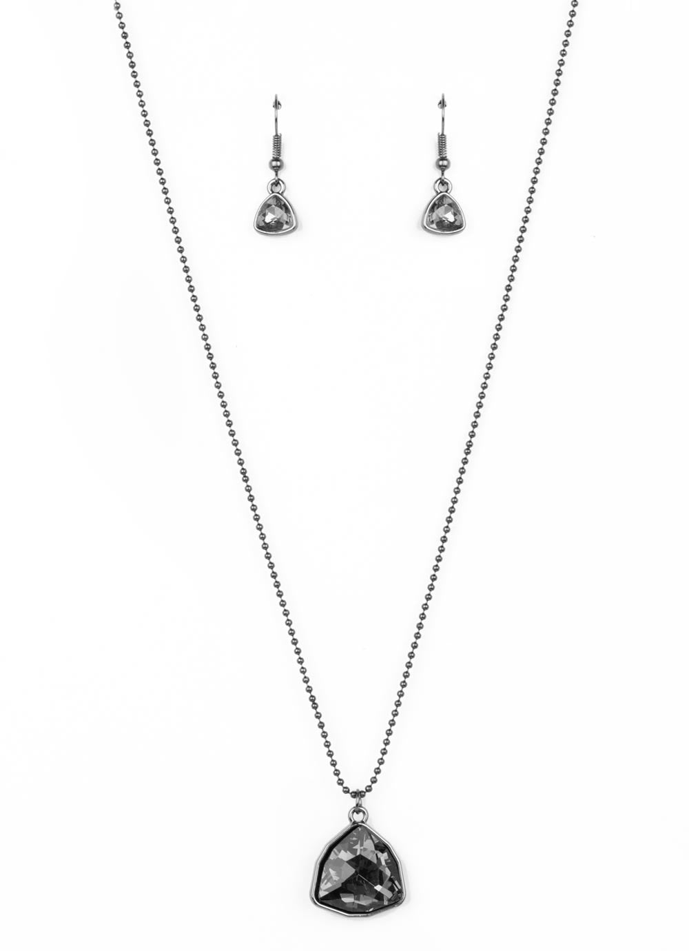 A faceted asymmetrical smoky gem is encased in a sleek gunmetal frame at the bottom of a gunmetal popcorn chain, creating a stellar pendant below the collar. Features an adjustable clasp closure.