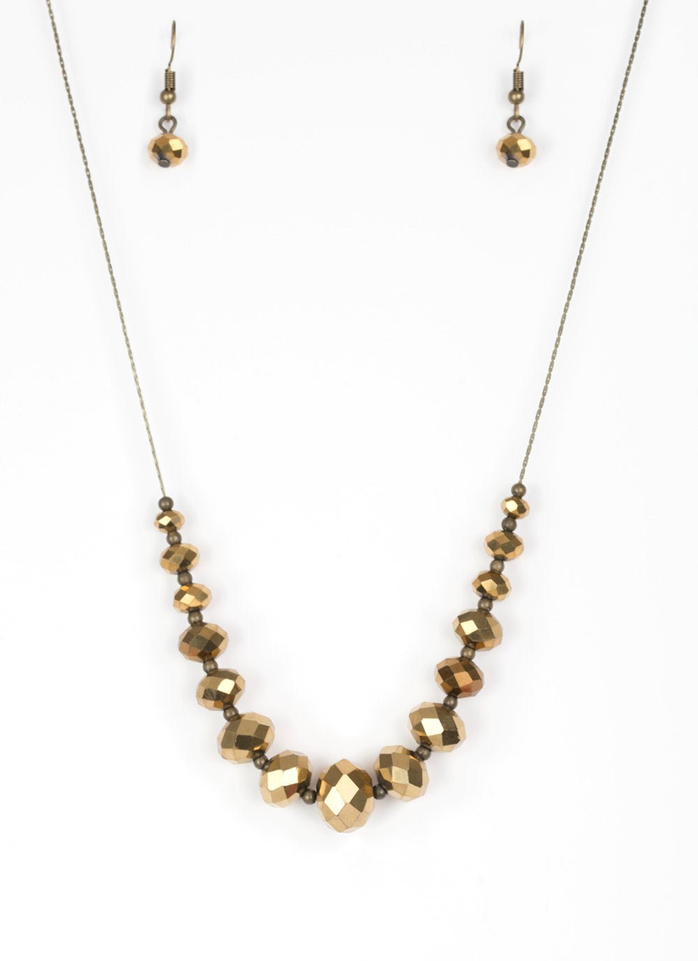 Faceted aurum beads and dainty brass beads are threaded along a flat brass chain below the collar. The sparkling crystal-like beads gradually increase in size near the center for a refined finish. Features an adjustable clasp closure. Paparazzi Accessories.